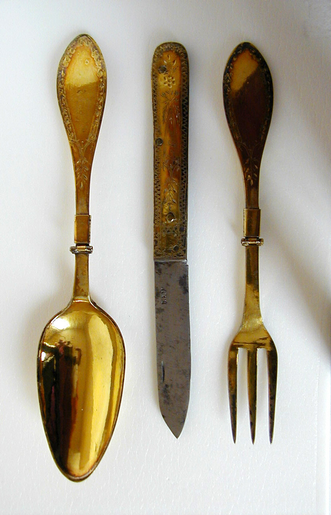 Folding Fork with Engraved Decoration From Traveling Cutlery Set Fork; possibly Germany; gold plated, silver; L x W x D: 18.9 × 2.5 × 0.9 cm (7 7/16 in. × 1 in. × 3/8 in.) L x W x D (folded): 10.5 × 2.5 × 1.2 cm (4 1/8 in. × 1 in. × 1/2 in.); The Robert L. Metzenberg Collection, gift of Eleanor L. Metzenberg; 1985-103-257