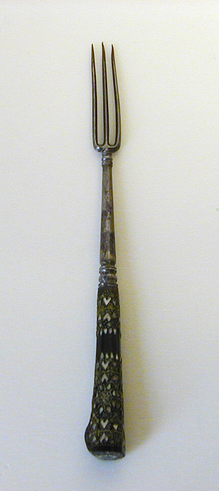 This is a fork. It is dated ca. 1630 and we acquired it in 1985. Its medium is steel, gold, horn, mother of pearl. It is a part of the Product Design and Decorative Arts department.