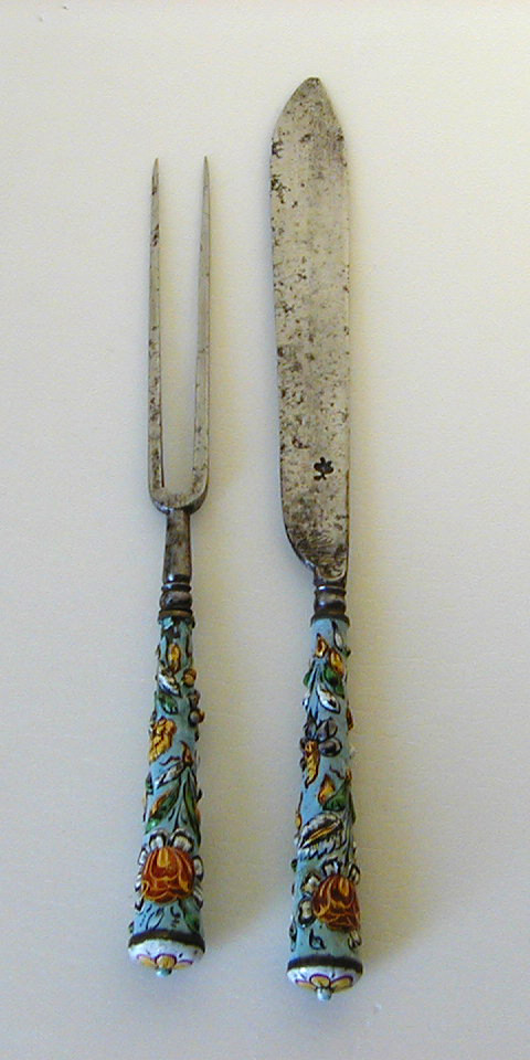 Generally speaking, up until the late seventeeth century and, in some cases, later, hosts did not provide cutlery to their guestsl people traveled with their own sets. Since knives and their cases were mae of various valuable materilas, it was through the knife that the importance of design, materials, and craftsmanship entered the realm of flatware. Due to its softness, gold was not the ideal choice for a handle; instead, coral, hardstone (figs. 12, 13), enamel (fig. 14), and carved ivory (fig. 15) demonstrated one's taste and wealth.