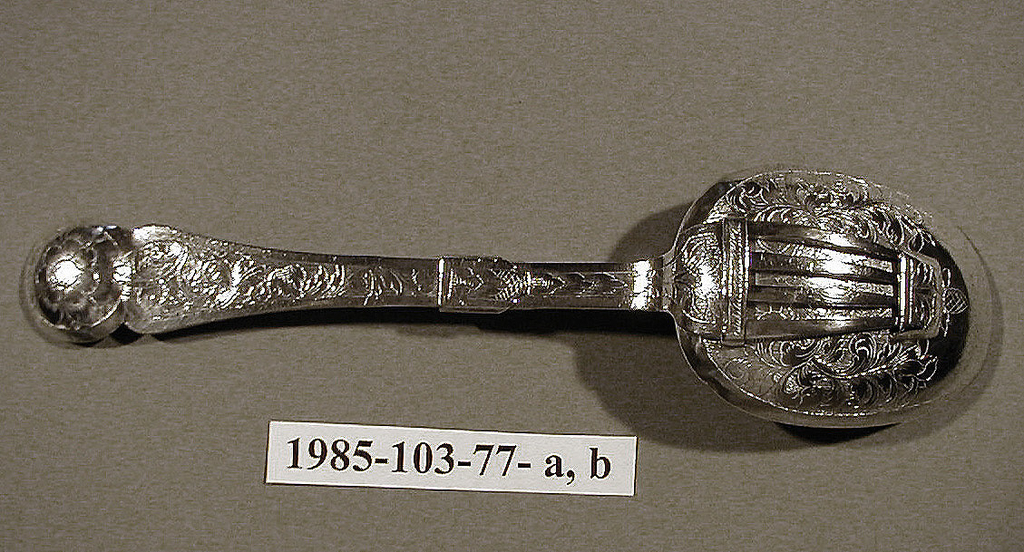 Although it was the norm for individuals to travel with cutlery and other flatware until the late seventeenth and early eighteenth century, this custom did not die out when hosts started to provide flatware for their guiests. Traveling sets continued to be used when visiting inns, as exemplified by Celia Fienne's will cited above, and for picnics, hunts, and other outdoor occasions, well into the twentieth century. The sets often were hinged to fold (figs. 50, 51), and may have had fittings on the spoon to hold the tines (fig. 52) rather than having small or removeable handles as earlier pieces did.