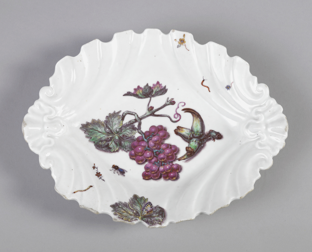 This is a dish. It was designed by Nicholas Sprimont and manufactured by Chelsea Porcelain Manufactory. It is dated 1750–1752 and we acquired it in 1985. Its medium is soft paste porcelain, vitreous enamel. It is a part of the Product Design and Decorative Arts department.