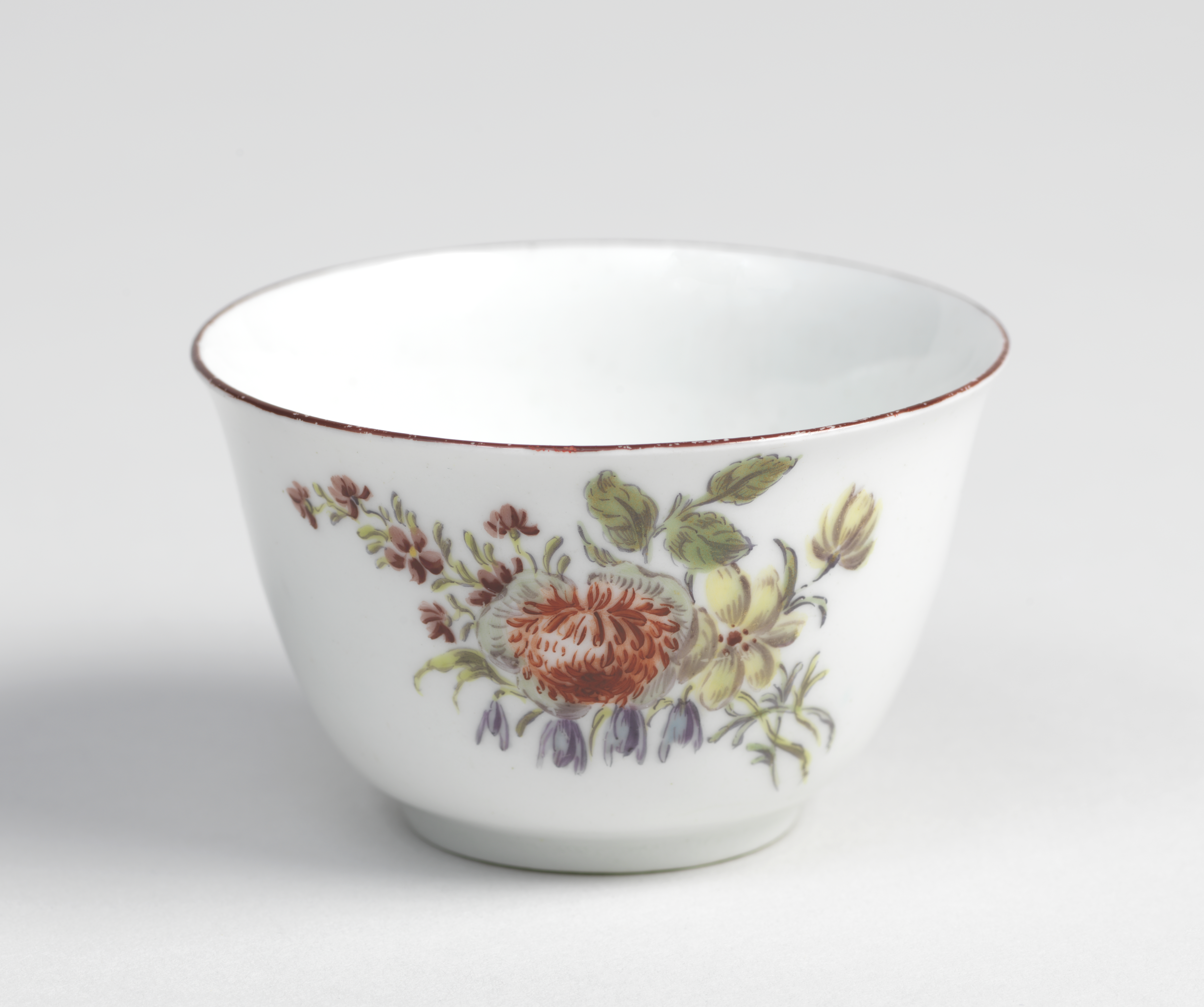 This is a tea bowl and saucer. It was manufactured by Chelsea Porcelain Manufactory. It is dated ca. 1755 and we acquired it in 1985. Its medium is soft paste porcelain, vitreous enamel. It is a part of the Product Design and Decorative Arts department.