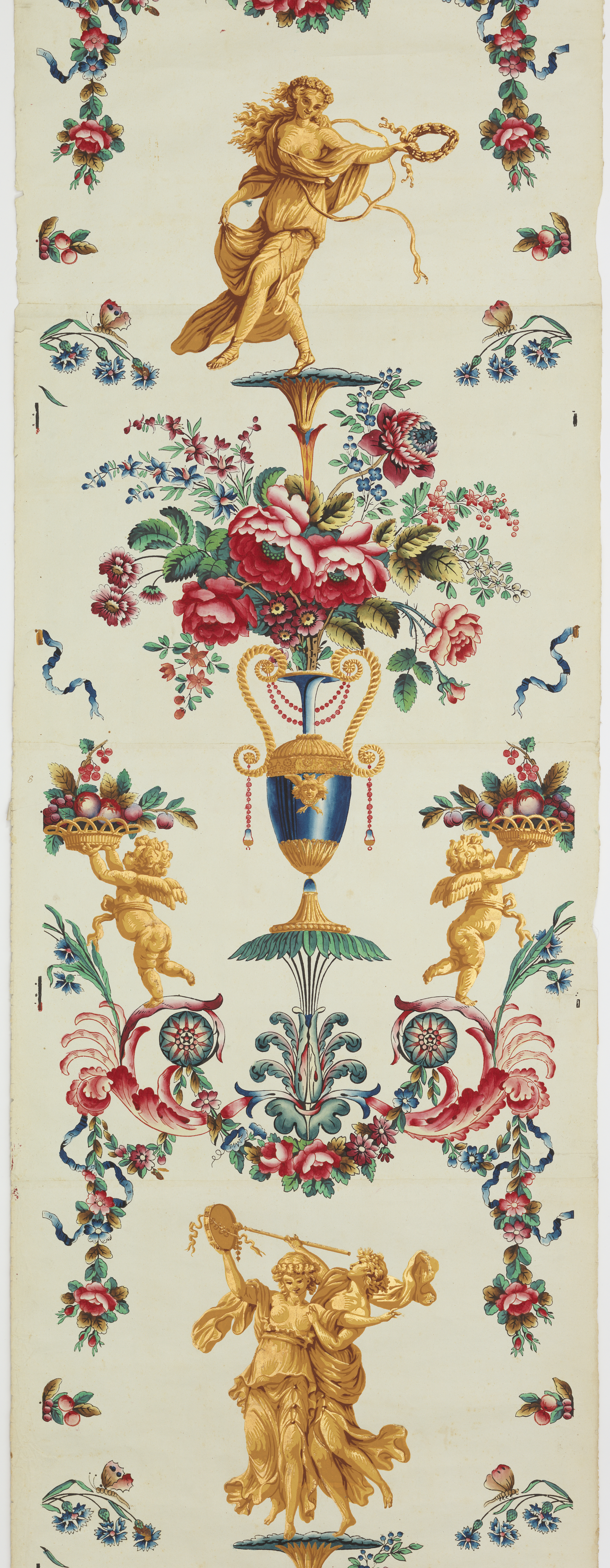 This very high-end production was created by Jean-Baptiste Reveillon, one of the premier manufacturer’s in Paris. This full, unused roll of paper is woodblock printed, hand painted and contains applied gold leaf. It still retains the original end paper bearing the Manufacture Royale stamp. The design contains four repeats, each bearing different classical figures balanced on a floral plateau rising out of the floral bouquet. Arabesque designs were inspired by the excavations at the recently discovered ruins of Pompeii and Herculaneum. Réveillon’s arabesques consisted of three types: large panels of a single arabesque design, narrow arabesques used to frame the larger panels, and repeating arabesque patterns printed in either a single or double-column format, with the single-column used here.