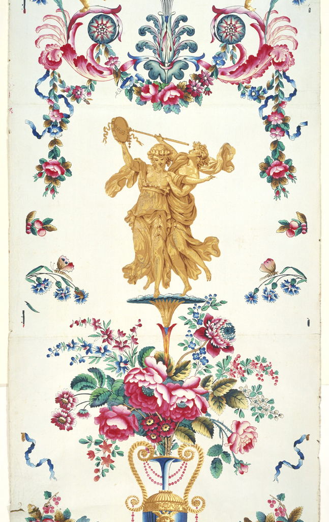 This very high-end production was created by Jean-Baptiste Reveillon, one of the premier manufacturer’s in Paris. This full, unused roll of paper is woodblock printed, hand painted and contains applied gold leaf. It still retains the original end paper bearing the Manufacture Royale stamp. The design contains four repeats, each bearing different classical figures balanced on a floral plateau rising out of the floral bouquet. Arabesque designs were inspired by the excavations at the recently discovered ruins of Pompeii and Herculaneum. Réveillon’s arabesques consisted of three types: large panels of a single arabesque design, narrow arabesques used to frame the larger panels, and repeating arabesque patterns printed in either a single or double-column format, with the single-column used here.