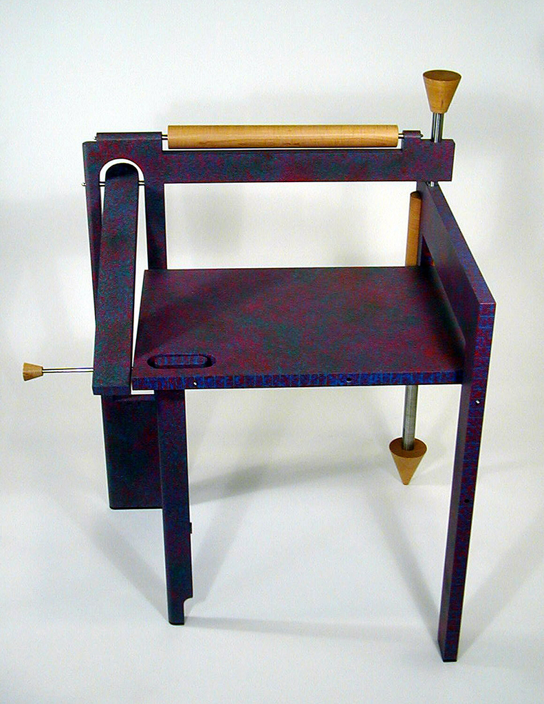 This is a Armchair. It was designed by Tom Loeser. It is dated 1984 and we acquired it in 1985. Its medium is maple (wood), paint, metal. It is a part of the Product Design and Decorative Arts department.
