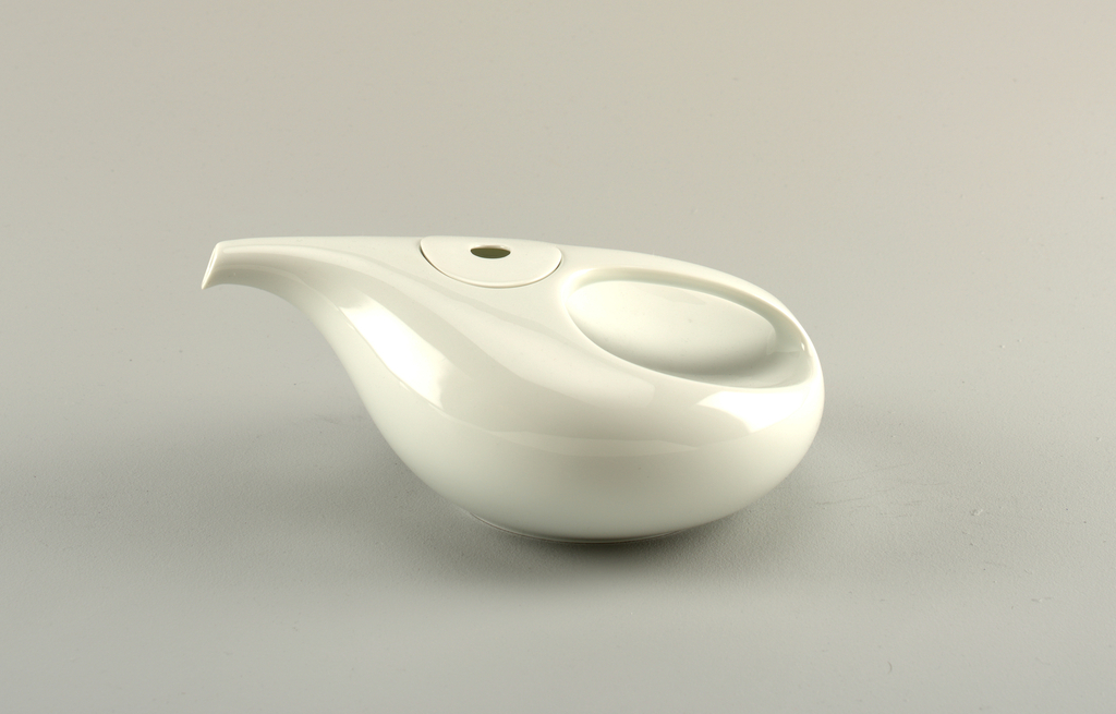 This is a Teapot and lid. It was designed by Luigi Colani and manufactured by Rosenthal Glas und Porzellan Aktiengesellschaft and made for Studio-Line (Division of Rosenthal). It is dated 1971 and we acquired it in 1985. Its medium is molded and glazed porcelain. It is a part of the Product Design and Decorative Arts department.