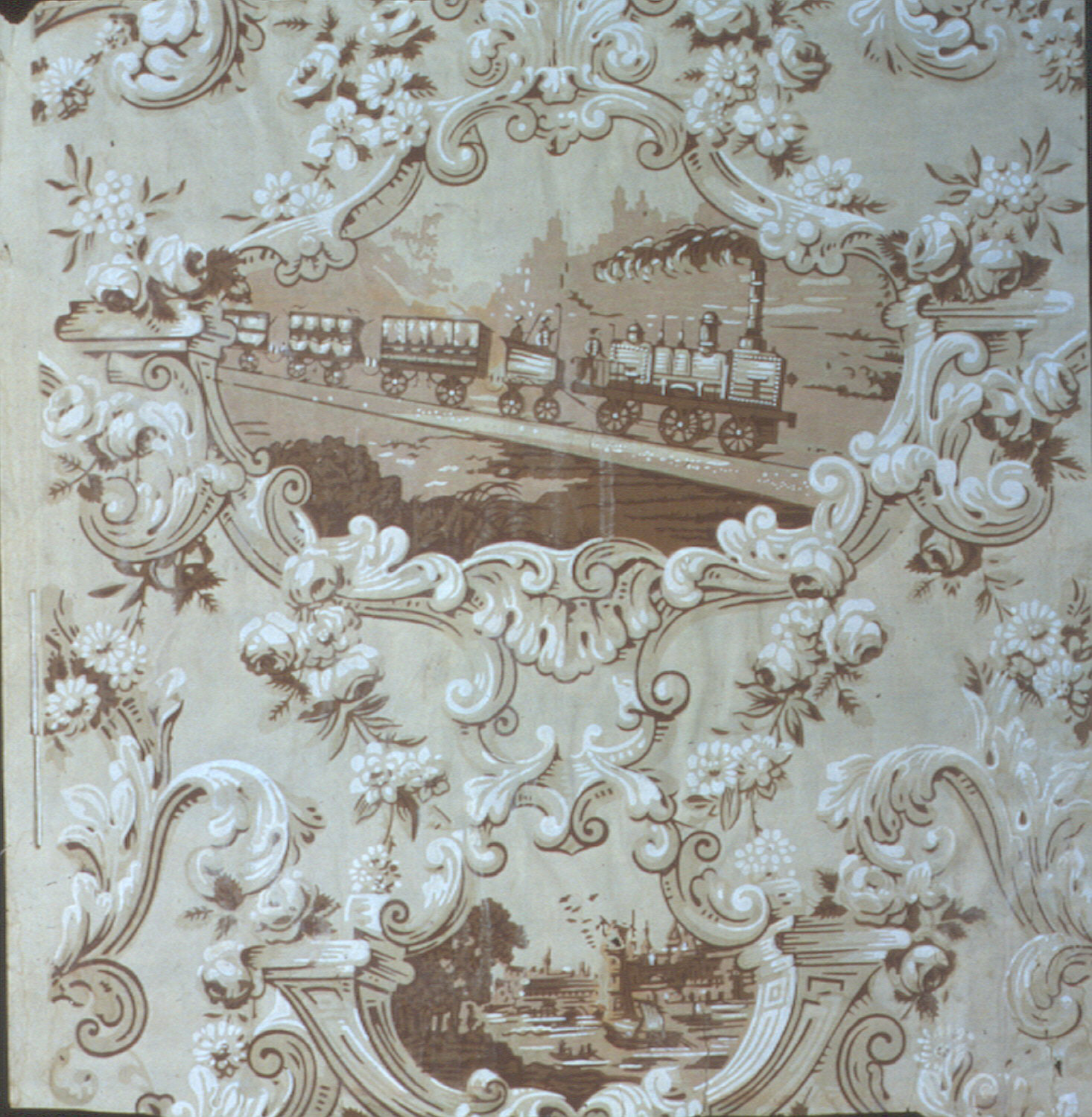 Innovations in transportation and mobility have been a common theme on wallpaper. Lush Rococo ornamentation contains two landscape scenes: an early steam locomotive alternates with a tall ship. The train appears to be a model designed by the Robert Stephenson Co. in England, 1835, whose trains were the first used successfully for the commercial rail transport of passengers and goods in Europe.