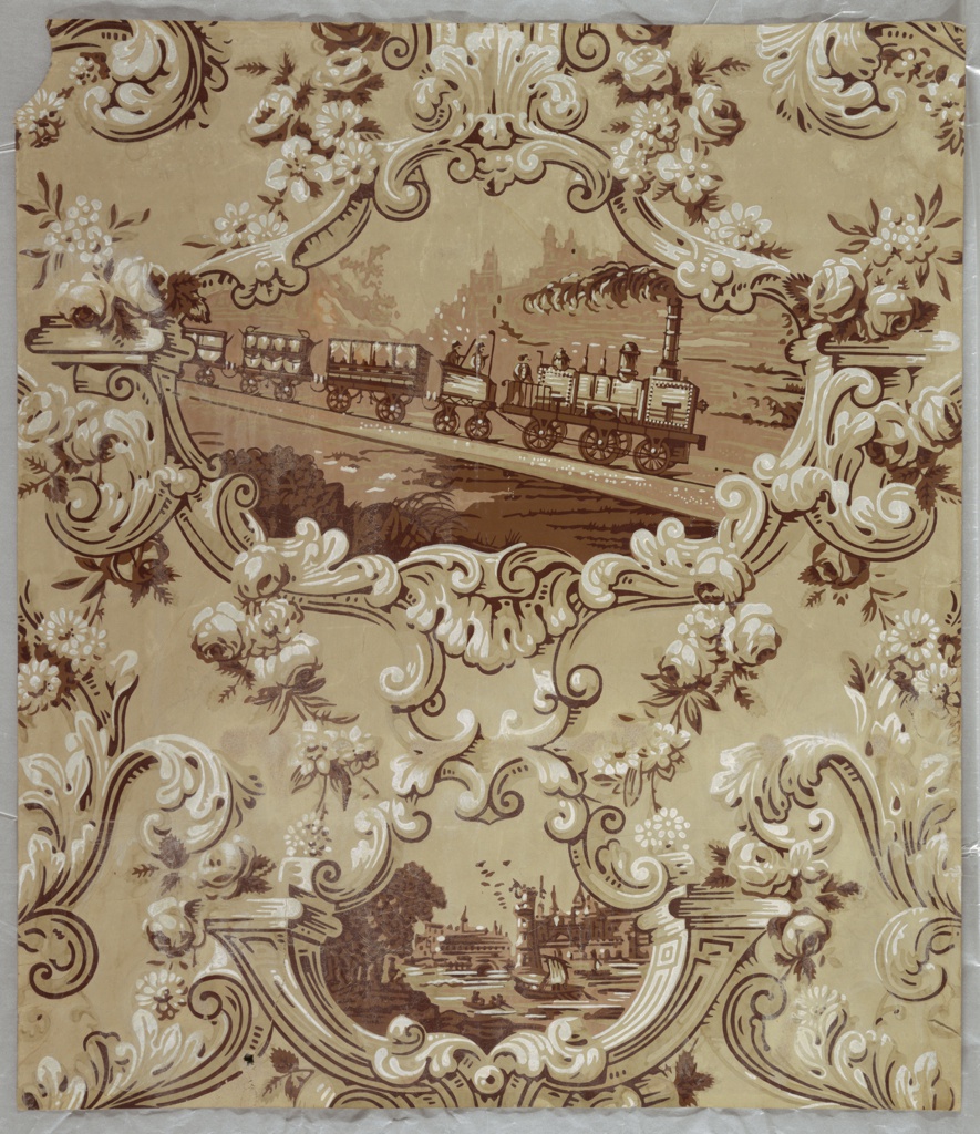 Innovations in transportation and mobility have been a common theme on wallpaper. Lush Rococo ornamentation contains two landscape scenes: an early steam locomotive alternates with a tall ship. The train appears to be a model designed by the Robert Stephenson Co. in England, 1835, whose trains were the first used successfully for the commercial rail transport of passengers and goods in Europe.