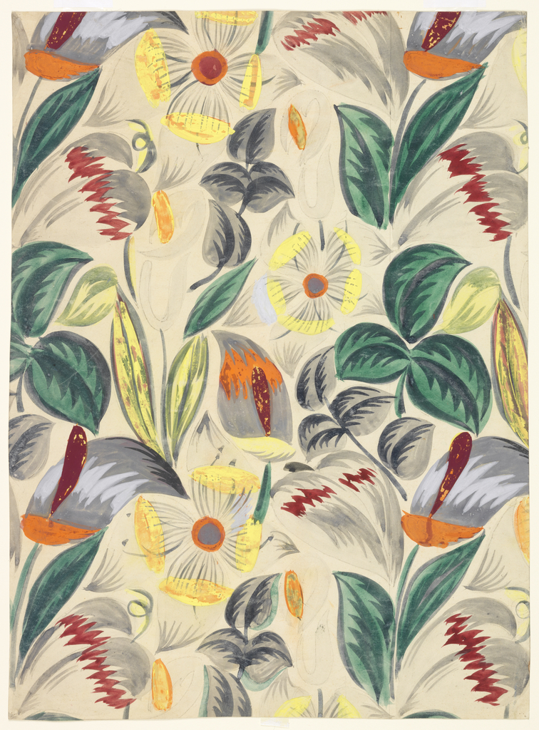 Drawing, Textile Design: Tropical Flowers; Designed by Raoul Dufy (French, 1877–1953); Manufactured by Bianchini-Férier, Inc. (France); France; brush and gouache on paper; 65.5 x 48.5 cm (25 13/16 x 19 1/8 in.), irregular; Museum purchase from General Acquisitions Endowment and Friends of Drawings and Prints Funds; 1985-50-7