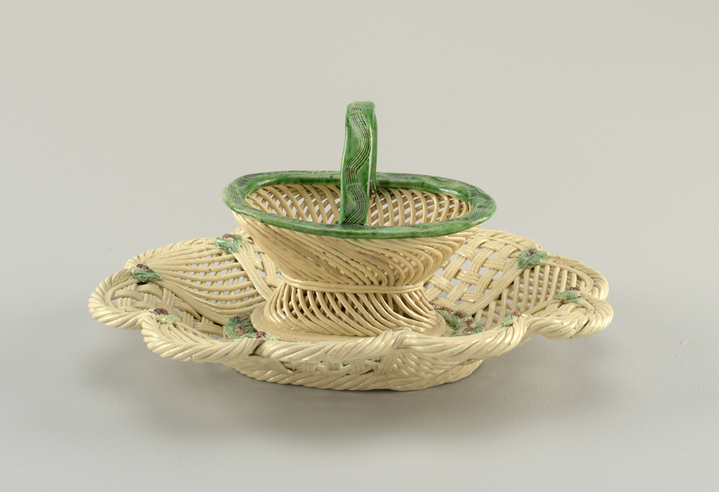 This is a Basket and tray. It is dated late 18th century and we acquired it in 1986. Its medium is glazed earthenware. It is a part of the Product Design and Decorative Arts department.