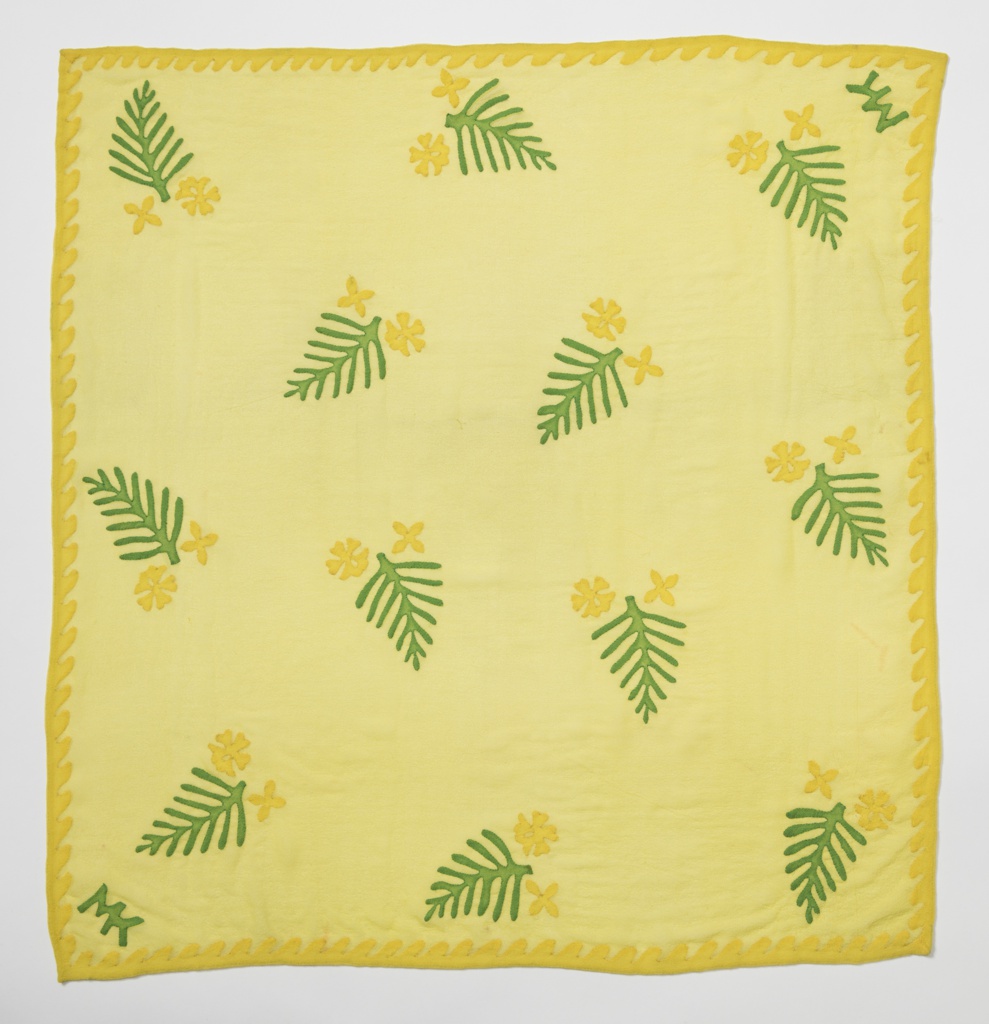 Numerous garments in the family’s collection, reproduced in Ashley Callahan’s monograph, “Modern Threads: Fashion and Art by Mariska Karasz,”[iii] show designs and techniques nearly identical to those in this scarf. It most closely resembles a pair of silk appliqué scarves Karasz created for her two daughters, Sloveig and Rozsika. Sloveig’s has a design of cats and leaves very similar to those seen here, while Rozsika’s features cupids, hearts, and arrows. Each scarf includes the girl’s name and the joined initials MK in the corner, as seen here.[iv] Karasz was consistently praised in the fashion press for her unusual color sensibility. The fresh yellow and green combination here is reminiscent of her 1937 collection, with “lively color combinations suggesting their suitability for resort wear.”[v]