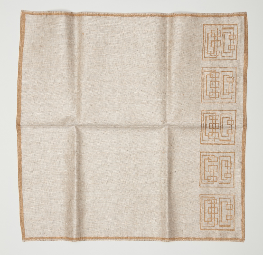Street was designed in 1962 and remained in production through 1973. It was one of several geometric, linear patterns she created in the late 1950s and early 1960s, including Line Play (1956), also in the museum’s collection. The napkins, with a design of interlocking rectangles along one edge, coordinated with a tablecloth with the same design in the center and the four corners. The set was offered in tan, green, olive, blue, or yellow.