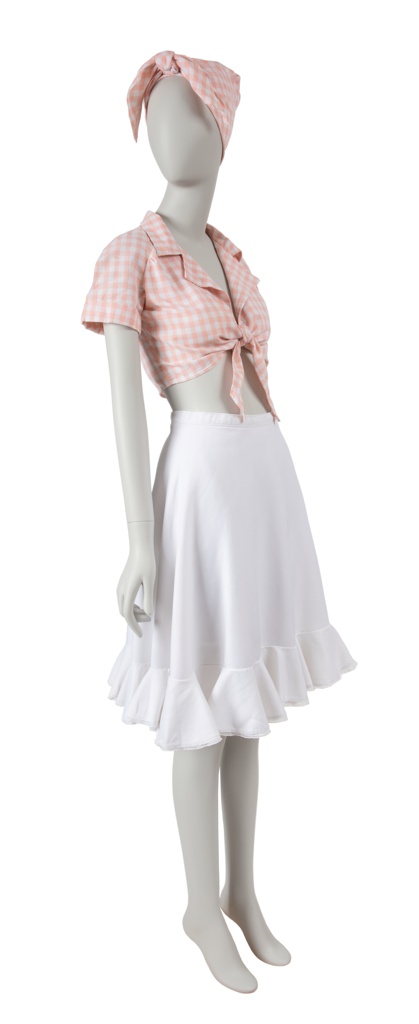 Smith frequently used varying weights of gingham, which has histories of use in Japan, India, and Africa. A plain-woven textile, typically cotton, with a checked colored pattern, gingham was a major export of mills in Manchester, England, during the eighteenth century, and has been produced in the United States for centuries. For this performance, Smith renders a blouse and African American woman's headwrap in this affordable utilitarian fabric.