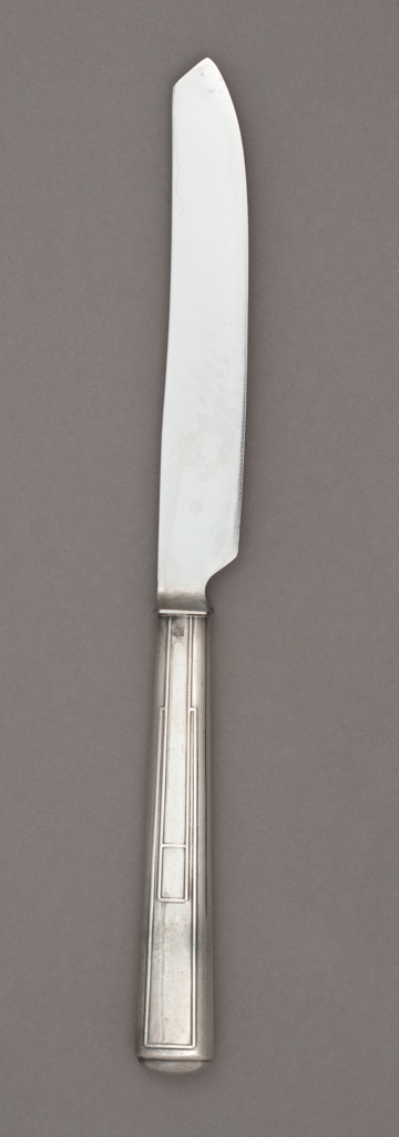 This is a knife. It was designed by Joseph Maria Olbrich and manufactured by Clarfeld & Springmeyer. It is dated 1901 and we acquired it in 2019. Its medium is metal, silver. It is a part of the Product Design and Decorative Arts department.