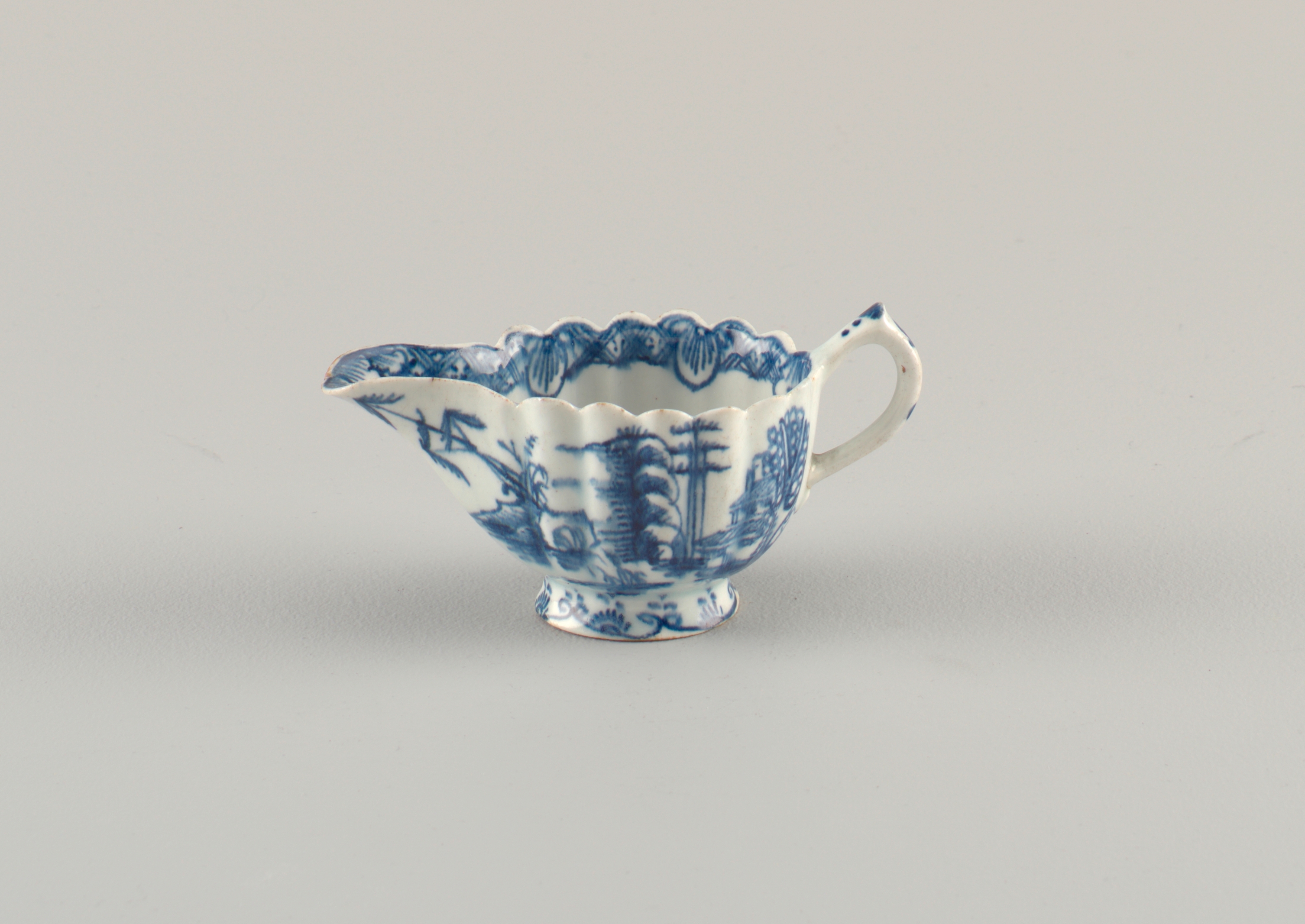 This is a creamboat. It was manufactured by Bow Porcelain Manufactory and Caughley Porcelain Factory. It is dated 18th century and we acquired it in 1938. Its medium is soft paste porcelain, vitreous enamel. It is a part of the Product Design and Decorative Arts department.