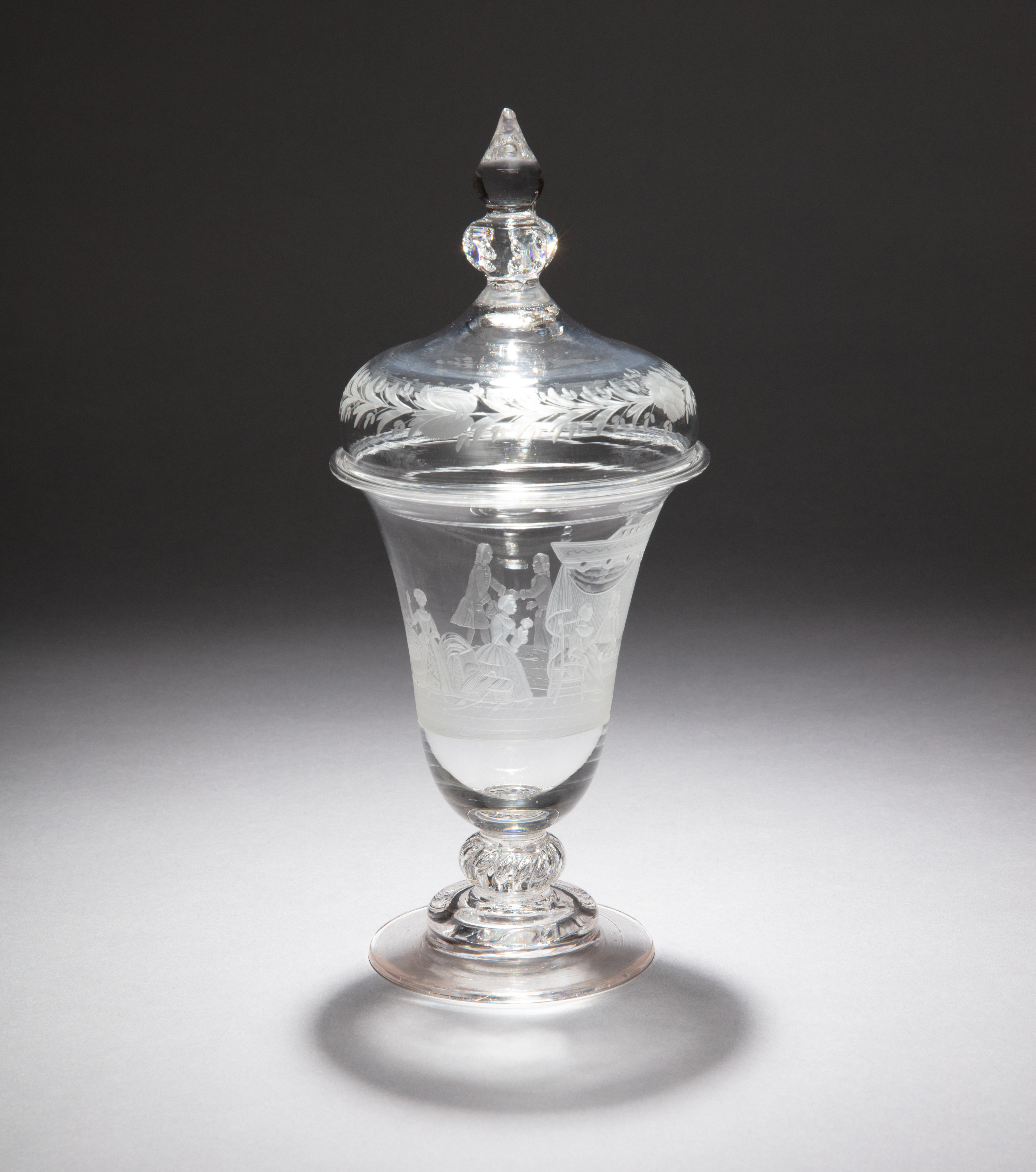 This is a drinking glass and cover. It is dated ca. 1760 and we acquired it in 2021. Its medium is lead glass. It is a part of the Product Design and Decorative Arts department.