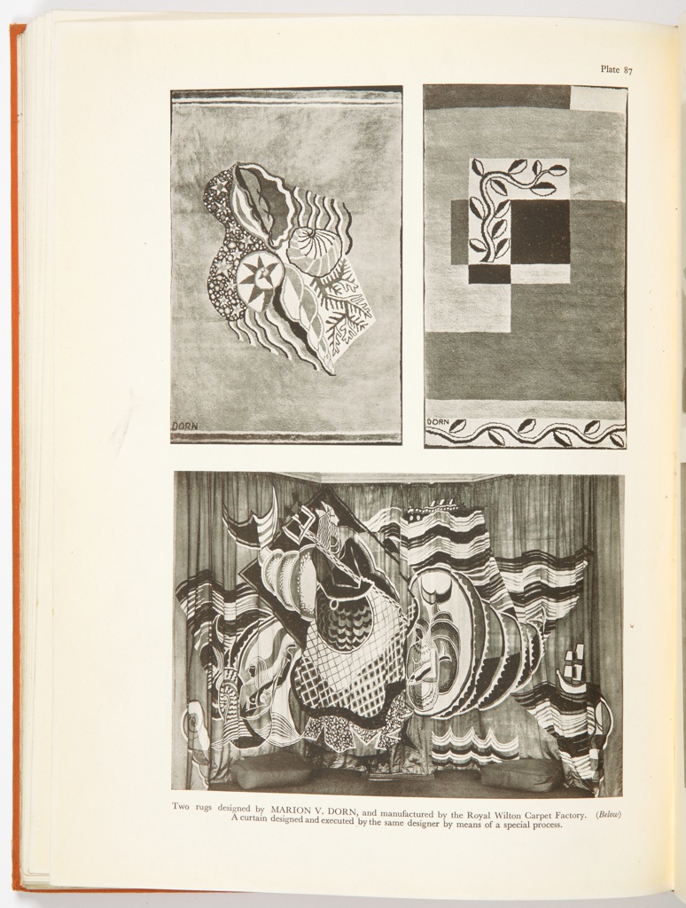 Kauffer and Dorn approached the rug as a medium for modern art and often included their individual signatures within the rugs’ patterns. One of the most important design books of the era was The New Interior Decoration by friends Dorothy Todd and Raymond Mortimer, who chose Kauffer’s vibrant mural design as the frontispiece. Chapters on rugs and textiles also included Kauffer’s and Dorn’s latest work.