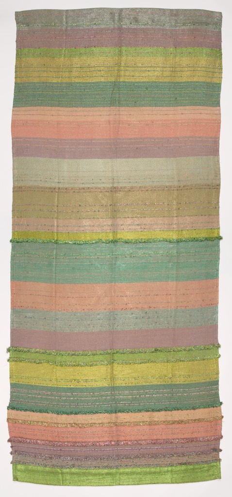 Liebes wove this color sampler to promote the Porcelain Colors range of Lurex yarns she developed for "subdued shimmer in decorative fabrics." Titled Birthday Party, it combined all six of the delicate pastel tints with subtle stripes of gold metallic and looped fringe. It was featured in the "The Thread of the Story is Lurex" ad campaign, accompanied by fine white porcelain objects.
