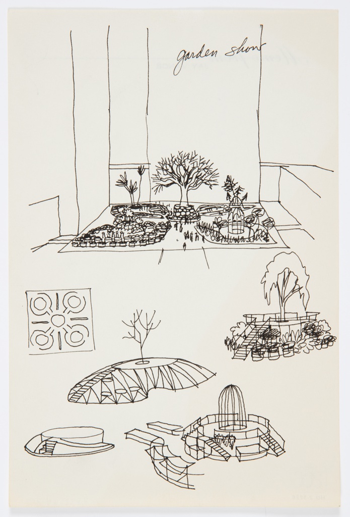 Drawing, Studies for Garden Show, World Trade Center; Architect: Minoru Yamasaki & Associates; Illustrated by Jay Vance; Client: The Port Authority of New York and New Jersey; Firm: Carlos Diniz Associates; pen and ink on paper; 21.6 × 14 cm (8 1/2 × 5 1/2 in.); Gift of Mark Cuban; 2021-23-24