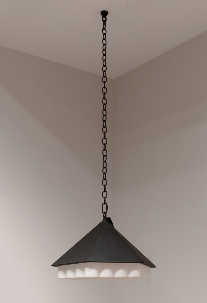 This Beehive pendant was part of an indoor/outdoor “Leisure Lighting” ensemble designed by DeRespinis in 1960 (as seen in the attached image) that included the Triple Light, Lamp Post, Bracket Light and a standing version of the Beehive. The Beehive’s striking form with textured black hood stands out in the series, and is a notable contribution to the lexicon of American design established mid twentieth century through the innovation and promotion of leading design offices such as Nelson’s. The lamp also gains access to the story of women designers whose grit, creativity and generosity opened up the discipline to future generations.