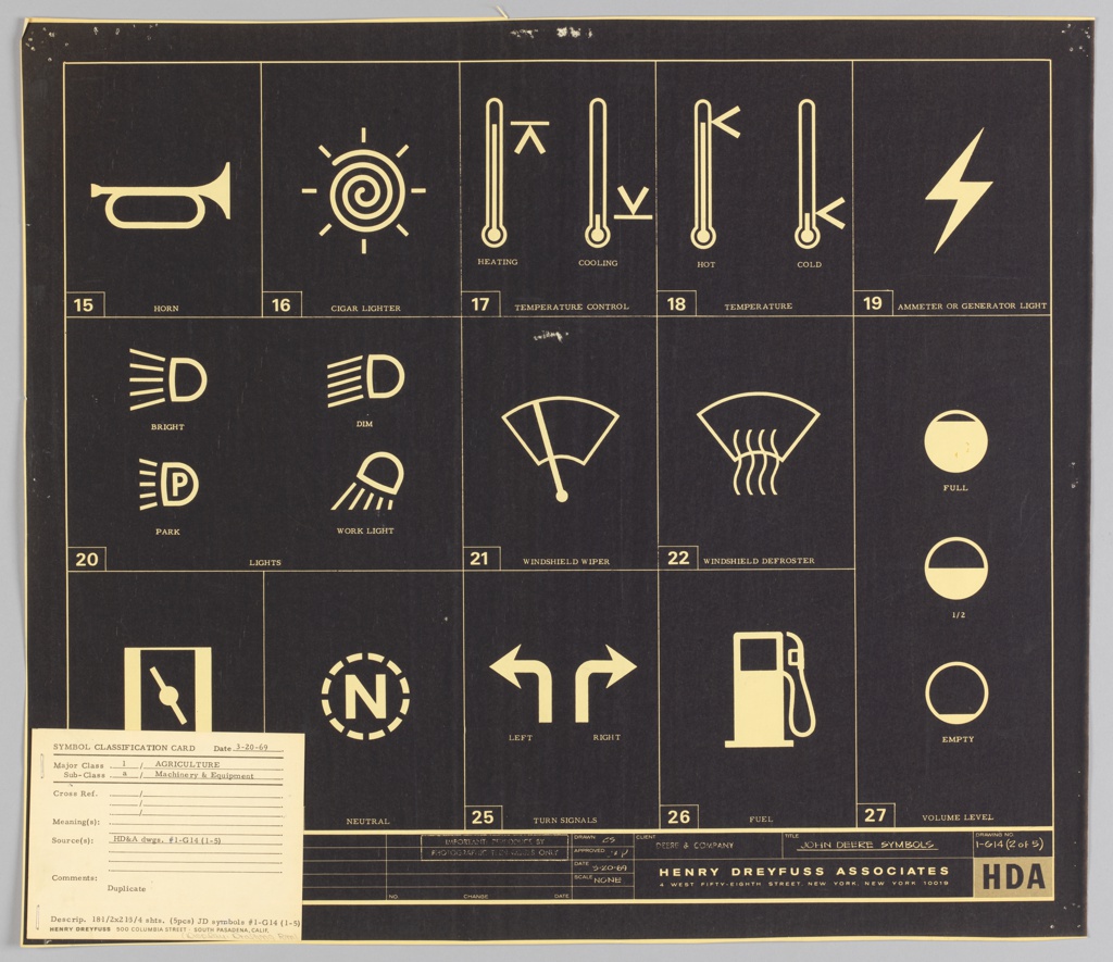 An image is easier to read in a limited space—such as on a control knob or a keyboard button—than a written caption. In the 1960s, as John Deere started selling farm equipment around the world, Dreyfuss and his design team placed symbols on all controls and instruments for the safety and ease of Deere’s global users.
