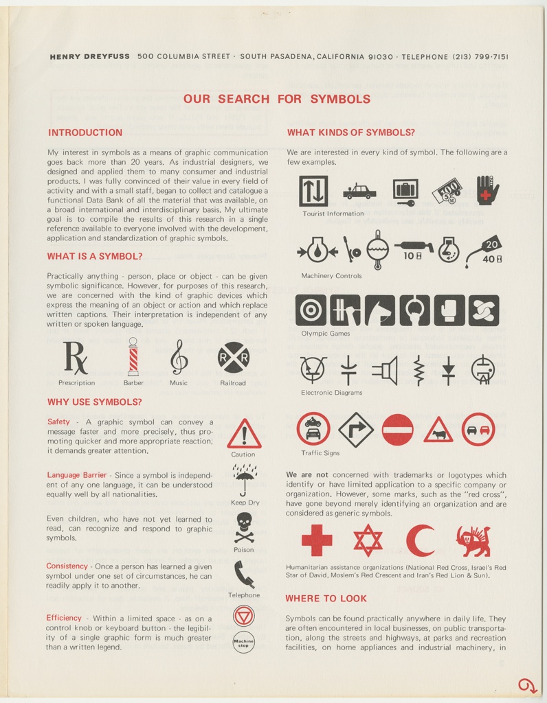 Dreyfuss worked closely with his staff and the public to ensure that the best symbols were chosen for publication. A questionnaire entitled "Our Search for Symbols" solicited thousands of designs from people around the world. Submissions reflected the many perspectives of symbol users and the challenges of meeting the needs of a diverse public with a single design.