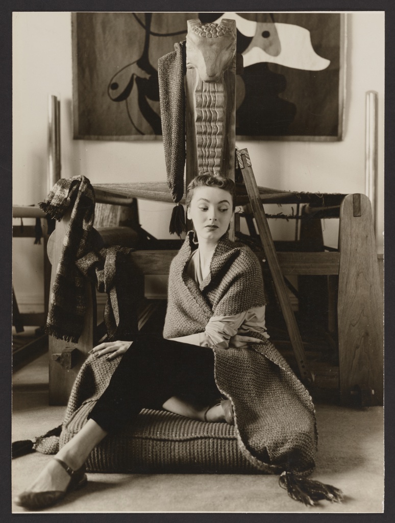 Liebes’s reputation as a craftsperson was often leveraged in advertising, even if the products on offer were machine woven. This photograph, used in a print ad that ran in The New Yorker magazine, was shot in Liebes’s studio. The model poses in front of Liebes’s distinctive Ram’s Head loom, seated on a Liebes floor cushion.