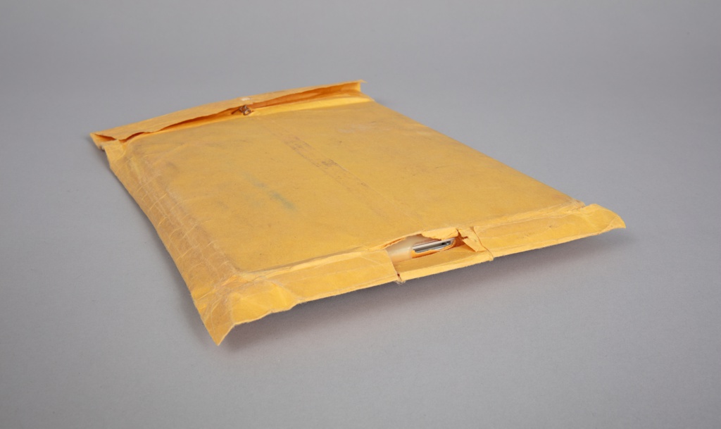 This is a prototype for a computer tablet case. It was designed by Tobias Wong and collaborator: Chelsea Briganti. It is dated 2010 and we acquired it in 2024. Its medium is paper (document envelope), aluminum, arsenic-free glass, plastic. It is a part of the Product Design and Decorative Arts department.