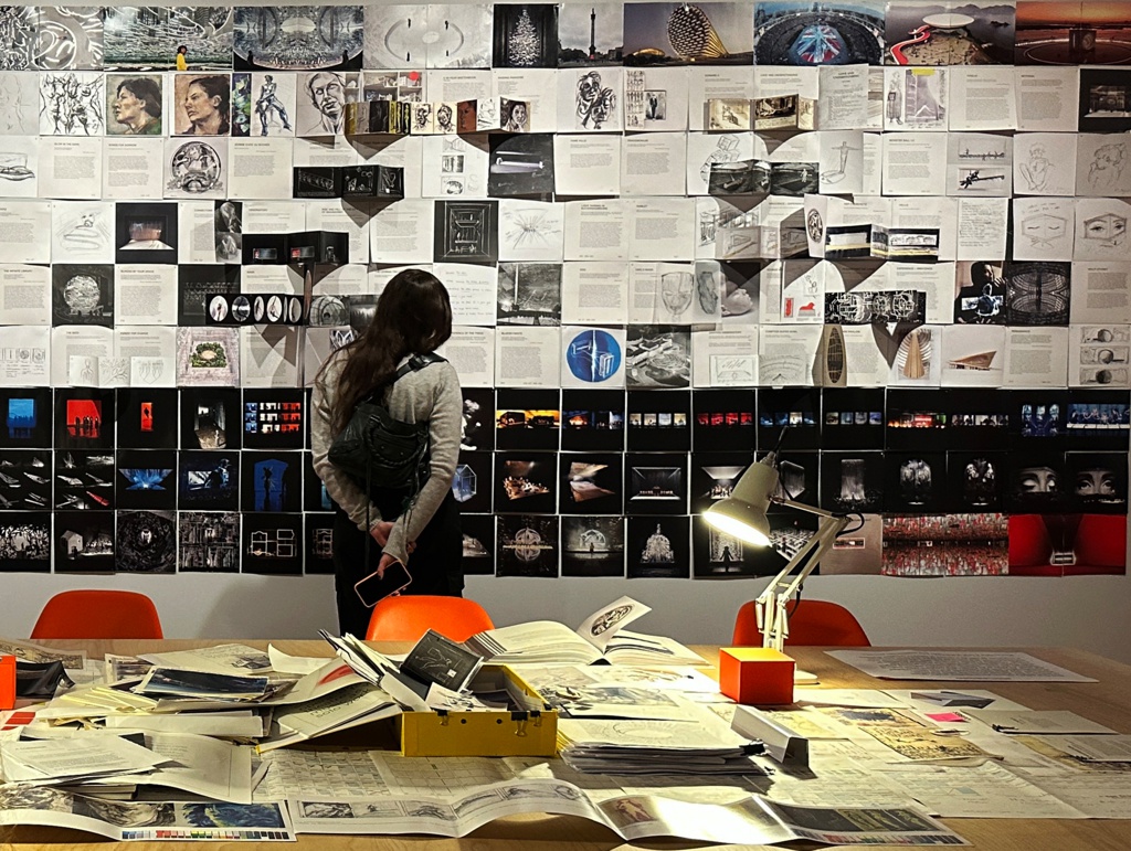 This final gallery returns you to Devlin’s studio, which is always in flux. At the center of the table is an installation of notes, mock-ups, color proofs, and page layouts Devlin and her team created in collaboration with the editors and curators while making the book An Atlas of Es Devlin. The book’s unbound pages wallpaper the room, charting connections across her work. Devlin wanted to play with the material qualities of a book, creating a tactile narrative. With die cuts, fold outs, transparencies, and mirrored papers, the book becomes a sculpture as well as a record of Devlin’s creative practice.