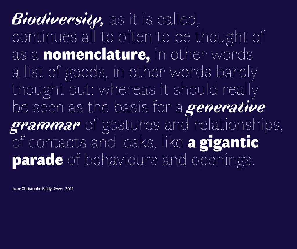 Faune is a digital sans-serif typeface family created by type designer Alice Savoie and commissioned by the Centre National des Arts Plastiques (CNAP) in partnership with Imprimerie Nationale. Savoie took inspiration from animal engravings in two historical texts from Imprimerie Nationale’s collection—Leclerc and de Buffon’s Histoire Naturelle (1749–1804) and Description de l’Égypt (1809). She was drawn to the diversity and richness of shapes among the animals, which would influence Faune’s variants. The ram’s broad body and slim legs informed Faune Black, which evokes nineteenth-century grotesques in its contrasted letterforms. The viper’s lithe, almost weightless form inspired Faune Thin, which became the typeface family’s skeleton. The most distinct and striking style is the Bold Italic, inspired by the ibis’s undulating neck and heavy body carried on skinny legs. Starting from these three Display variants, Savoie developed them to interpolate and come together as a family.