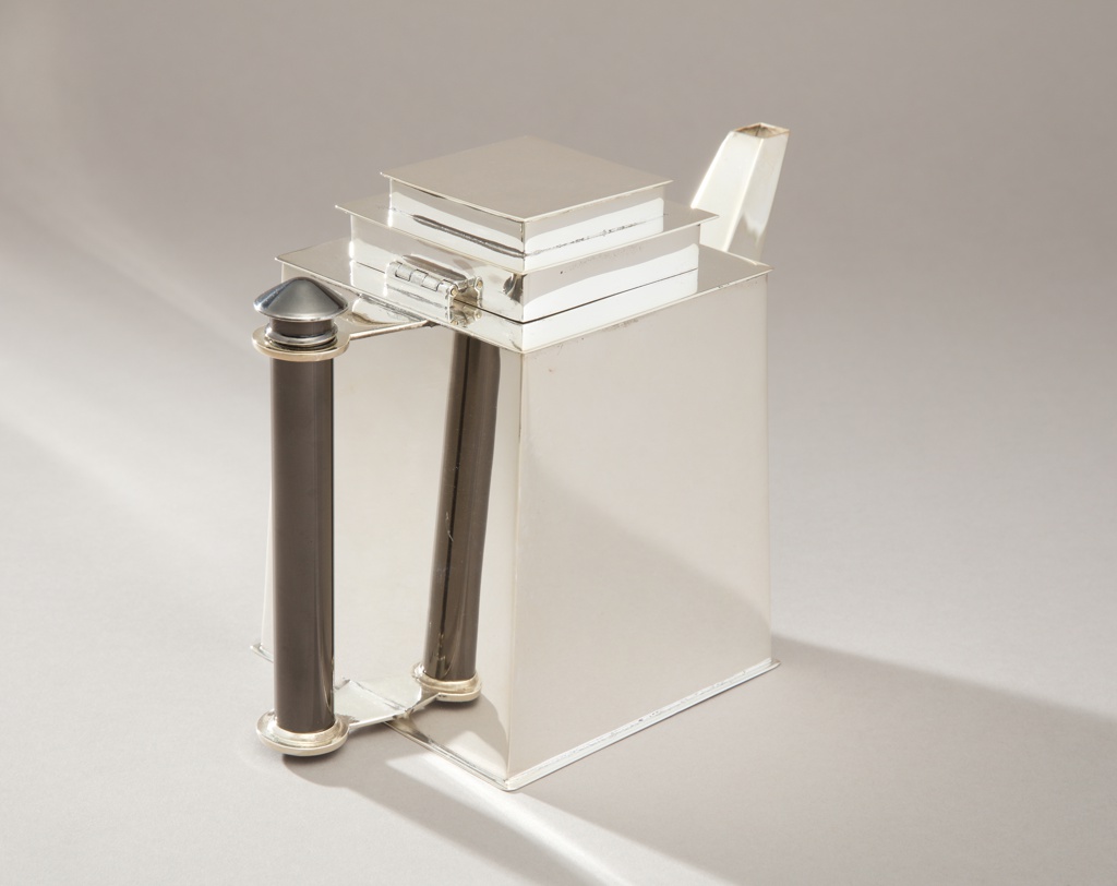 Sky-Scraper Teapot Teapot; Designed by Louis W. Rice (American, b. Germany 1872–1933); Manufactured by Apollo Studios; silver plated, nickel, metal; H x W x D: 16 × 21.4 × 11.3 cm (6 5/16 × 8 7/16 × 4 7/16 in.); Gift of George R. Kravis II; 2018-22-16-a,b