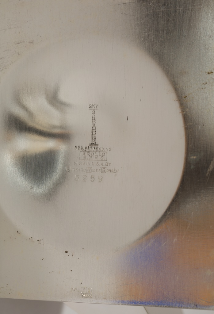 Under base, center: [1] “MADE IN U.S.A. BY/ BERNARD RICE’S SONS, INC.”, impressed (Manufacturer’s mark, Bernard Rice’s Sons, Inc.) [2] "APOLLO” over “E.P.N.S.”, impressed (Manufacturer’s mark with standard) [3] “SKY” with horizontal bar over vertical “SCRAPER,” over a horizontal bar, impressed (model name and logo) [4] "DES. PAT. PENDING”, impressed (patent mark) [5] “5259”, impressed (model number) At outer edge of base: [1] “PAT’D 75387/75650/75698”, impressed (patent numbers)