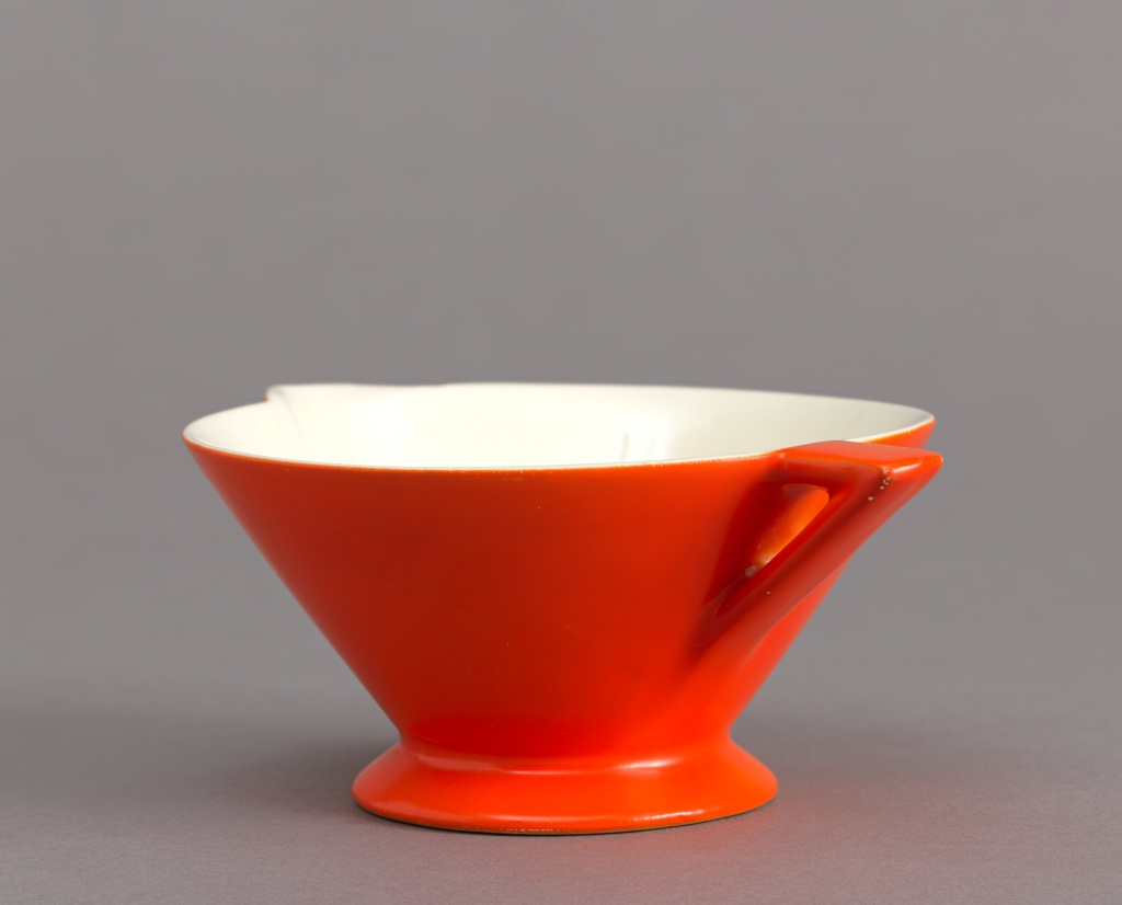 Don Schreckengost created the Tricorne ceramic tableware as a nineteen-year-old student with The Salem China Company. Tricorne was often sold alongside the Streamline shape. The Salem China Company partnered with Warner Brothers and hired movie stars to sit for publicity photographs taking tea with Tricorne and Streamline. These promotions, as well as Tricorne and Streamline’s modern color and pattern serve as reminders of the strategies that manufacturers enacted to maintain a profit during the Great Depression.