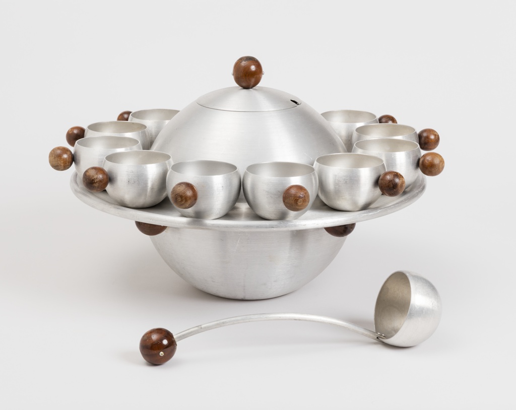 Saturn Punch Service Punch Bowl, Cups, Trays; Designed by Russel Wright ((American, 1904–1976)); Manufactured by Wright Accessories; aluminum, walnut; H x diam. (Punch bowl and lid together): 30.5 cm (12 in.) H x W (Cup tray): 1.3 × 41.9 cm (1/2 × 16 1/2 in.) H x W x D (Cup): 5.5 × 10.5 × 8 cm (2 3/16 × 4 1/8 × 3 1/8 in.) H x W x D (Ladle): 9 × 30.5 × 9 cm (3 9/16 in. × 12 in. × 3 9/16 in.); Gift of George R. Kravis II; 2018-22-50-1/29