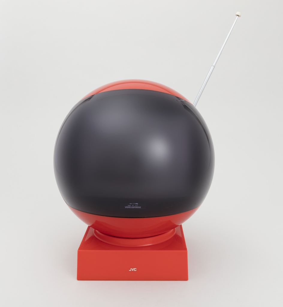The Videosphere portable television could be considered one of the most iconic electronic devices of the late twentieth century. Manufactured by JVC from 1970 through the early 1980s, the device combines the period’s preoccupation with space exploration with modern plastic and acrylic materials perfectly suited for the Videosphere’s cosmic aesthetic. The set was designed to be highly versatile and mobile; it rotates 360° on its square pedestal for viewing from any angle, and the chain affixed to the top of the device allows it to be mounted from the ceiling or hand-carried from one location to another. Additionally, the device could be powered by a cord plugged into any household outlet or, when used remotely, by a rechargeable battery (one advertisement suggested bringing the set to the beach).