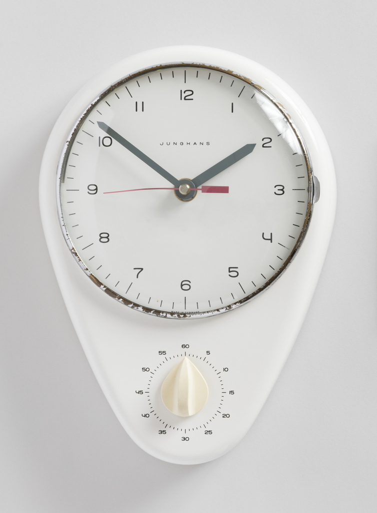 This is a Clock with Kitchen Timer. It was designed by Max Bill. It is dated 1956–1957 and we acquired it in 2016. Its medium is molded and glazed earthenware, glass, chrome-plated metal, painted metal, molded plastic. It is a part of the Product Design and Decorative Arts department.