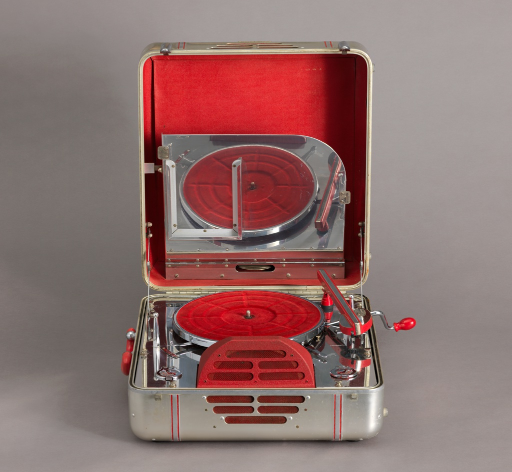 This is a phonograph. It was designed by John Vassos, Alfred Weiland and Selden T. Williams and manufactured by RCA Manufacturing Company, Incorporated. It is dated ca. 1935 and we acquired it in 2016. Its medium is aluminum, chromium-plated steel, metal, plastic, felt, leather, velvet. It is a part of the Product Design and Decorative Arts department.