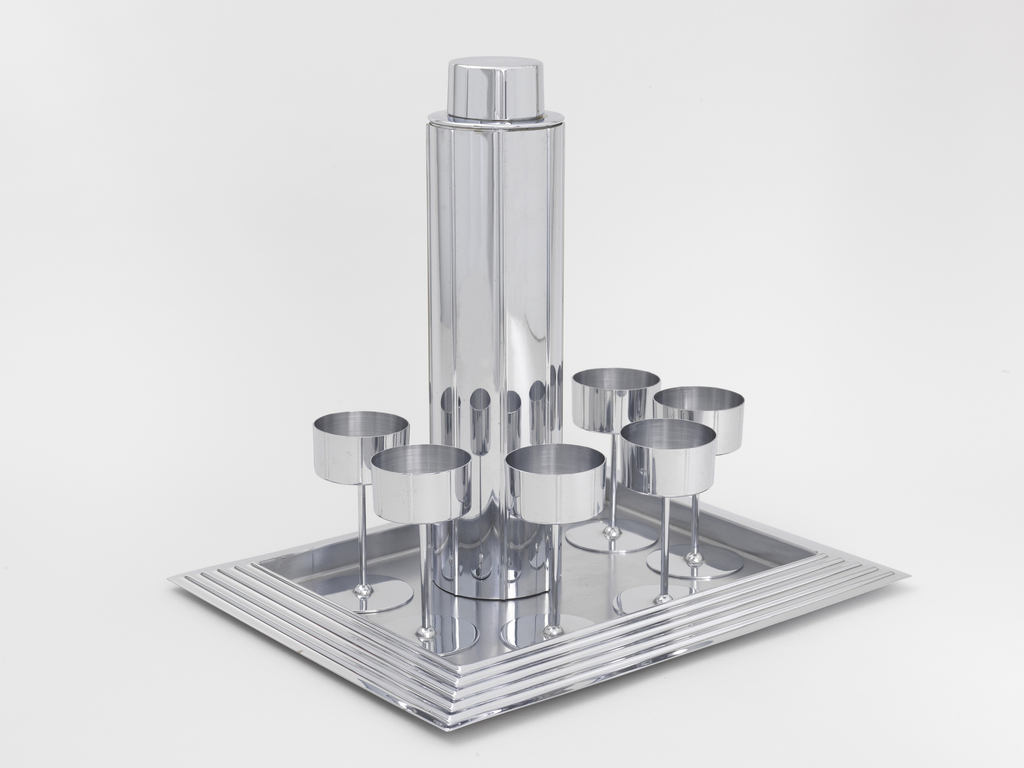 Both the name and the design of Norman Bel Geddes’ “Manhattan” cocktail service evoke modernity and the metropolis. The service was designed for Revere Copper and Brass Incorporated in 1934. The shaker’s cylindrical form is ribbed allowing for considerable ease when in use; particularly for the condensation that would form on its chromium-plated surface. The sleek form of the shaker’s cylindrical cap is also used in reverse as the form for the cocktail goblets’ bowls. The stepped-form of the tray mimics the setback design of skyscrapers from the 1920s and 1930s, which was due to the 1916 setback ordinance, which regulated the height of the New York buildings at the street line.[1] Similar to other cocktail services of the period, Geddes’ penchant for emphasizing form rather than ornament is key to early American modernist industrial design. When prohibition ended in December of 1933, the demand and interest for barware such as this cocktail service soared, and manufacturers were quick to create barware for a wide-range of consumers. The cocktail set’s chromium-plated finish has the highly reflective surface of polished silver, but the metallic color gives a modernist aesthetic that matches the skyscraper set-back aesthetic that spoke to the wallet as well as personal taste.