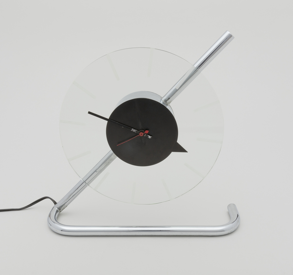 This is a clock. It was designed by Gilbert Rohde. It is dated 1934. Its medium is bent chrome-plated tubular brass, enameled brass, plate glass. It is a part of the Product Design and Decorative Arts department.