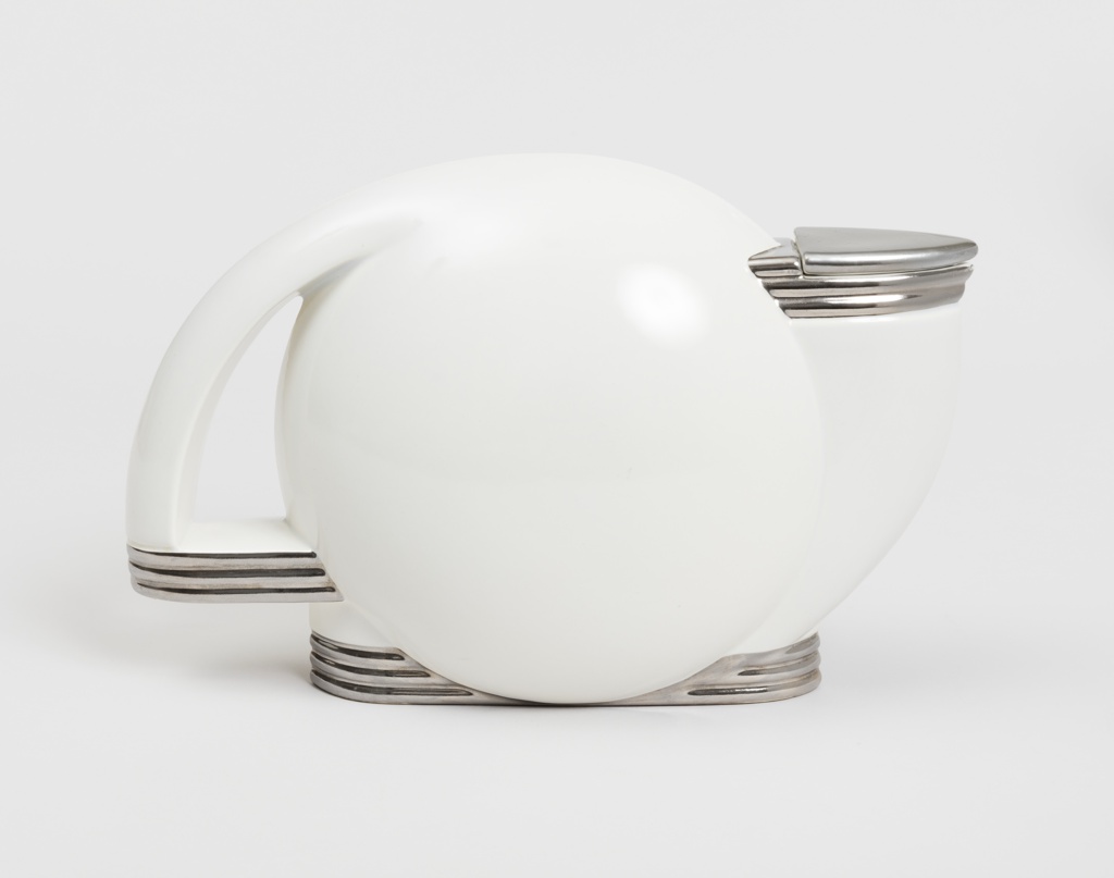 This is a teapot. It was designed by Paul Schreckengost and manufactured by Gem Clay Forming Company. It is dated 1938 and we acquired it in 2016. Its medium is molded and glazed earthenware trimmed in platinum. It is a part of the Product Design and Decorative Arts department.