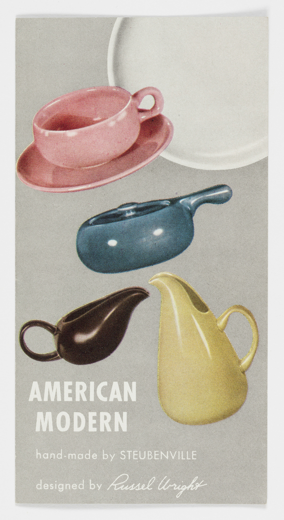 Industrial designer, Russel Wright developed a line of popular “American Modern” dinnerware that was manufactured by Steubenville Pottery Company between 1939 and 1959. This color brochure, with its accompanying price and order form, provides information on plates, bowls, casseroles, pitchers, and other mass produced, affordable, and colorful items designed by Wright for modern yet fashionable everyday dining. During the twenty years in which American Modern tableware was produced, American consumers purchased more than 250 million pieces.