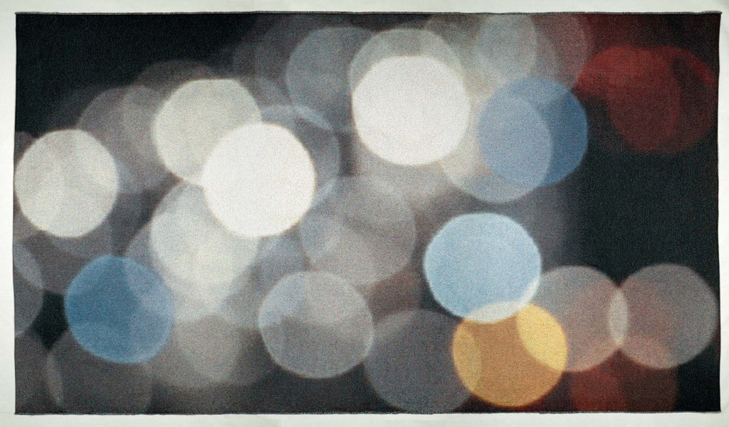 Rush Hour 2 is part of a series "Traces of Light" – a collaboration with her filmmaker/director husband, Bo Hovgaard – that captures big cities at night. In this particular work Hovgaard’s video camera is unfocused as he captures the light in Shanghai from driving cars and advertising signs. Sorensen then selects individual images from the video and translates photographic pixels into threads, video recordings into weavings.