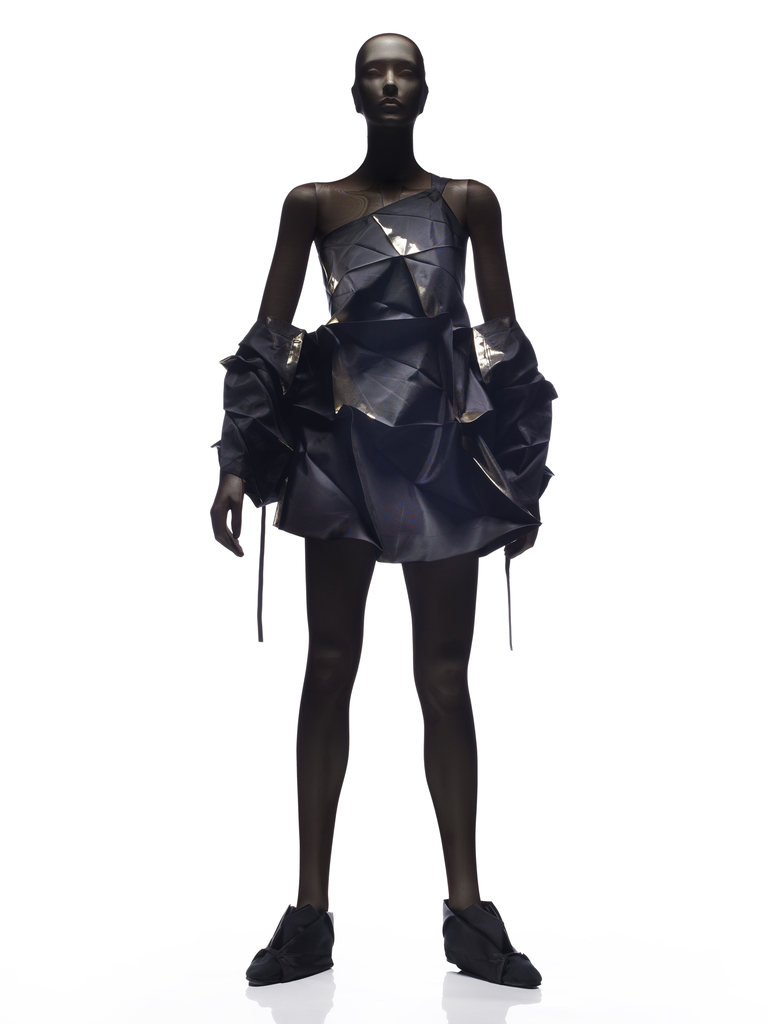 Skirt And Top, 132 5. Issey Miyake; Designed by Issey Miyake (Japanese, b. 1935), Reality Lab.; Japan; polyester from recycled pet bottles; H x W (skirt w/o tabs): 40 x 40 cm (15 3/4 x 15 3/4 in.) H x W (top w/o tabs): 29.8 x 60 cm (11 3/4 x 23 5/8 in.) H x W (mannequin): 167.6 x 61 cm (5 ft. 6 in. x 24 in.); Museum purchase from Friends of Textiles Fund; 2014-1-1-a,b