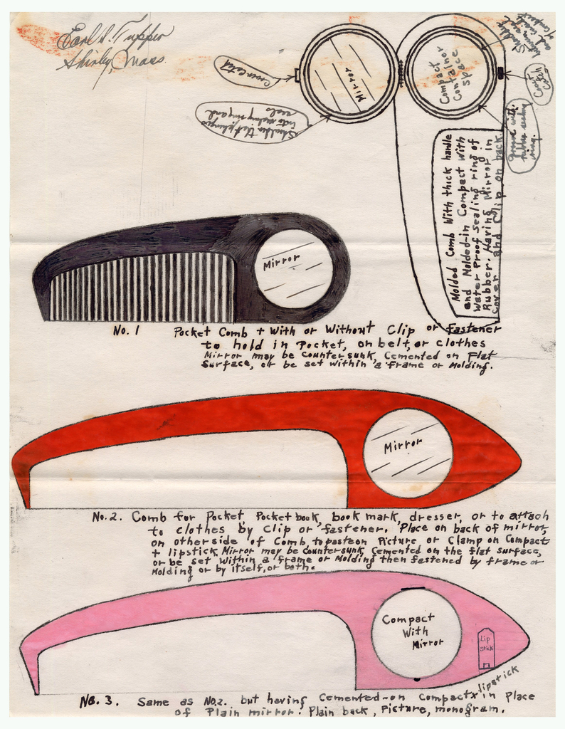 These sketches for various hair combs, each slightly different in size, color, style, and functionality, demonstrate prolific inventor Earl S. Tupper’s attention to detail and his interest in considering multiple approaches. Famous for inventing Tupperware, the inventor captured not only the idea but also his entire methodology in his sketching notebooks. With each invention, he dated it; noted it in a diary/notebook; began a folder on it as work starts; placed all bills, letters, and sketches relating to it in the folder; and made an outline of progress for each one.