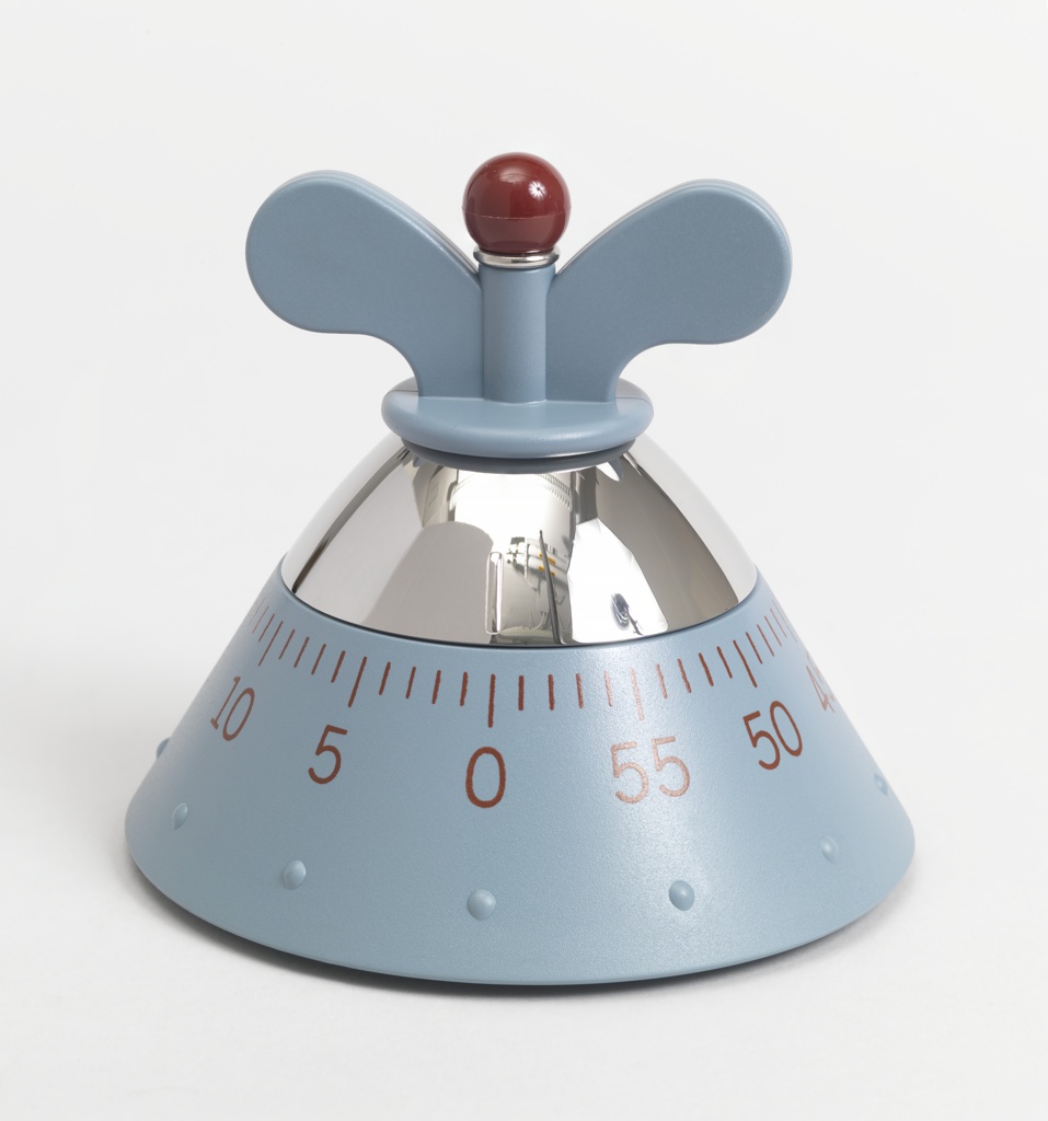 This is a timer. It was designed by Alexander Lee and Michael Graves and manufactured by Alessi S.p.A.. It is dated 1991 and we acquired it in 2014. Its medium is molded thermoplastic resin and abs plastic, polished stainless steel. It is a part of the Product Design and Decorative Arts department.