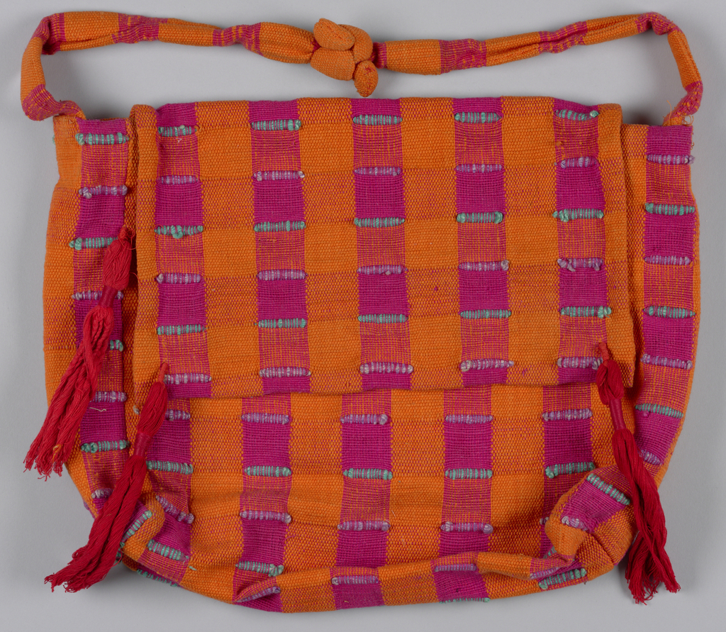 This is a Bag. It was designed by Sheila Hicks. It is dated 1965 and we acquired it in 2013. Its medium is cotton and its technique is plain weave with complementary warps, stripes of twill weave, with discontinuous supplementary wefts, hand woven. It is a part of the Textiles department.