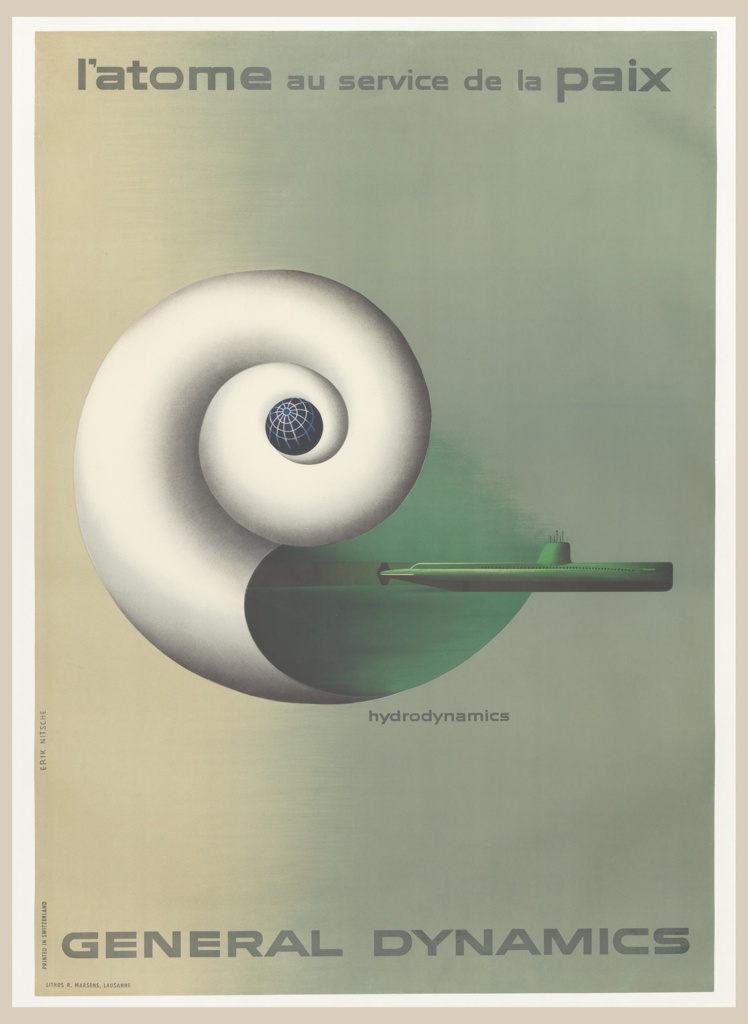 Poster, Hydrodynamics, L'Atome au Service de la Paix (Atoms for Peace); Designed by Erik Nitsche (Swiss, 1908–1998); Printed by Lithos R. Marsens; Client: General Dynamics Corporation (United States); Switzerland; offset lithograph on paper mounted on canvas; 126.5 × 89 cm (49 13/16 × 35 1/16 in.) Mount: 133 × 95.2 cm (52 3/8 × 37 1/2 in.); Gift of Arthur Cohen and Daryl Otte in memory of Bill Moggridge; 2013-42-9