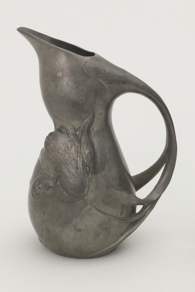 This is a Jug. It was manufactured by J. P. Kayser & Sohn. It is dated 1900–1902 and we acquired it in 2013. Its medium is pewter. It is a part of the Product Design and Decorative Arts department.