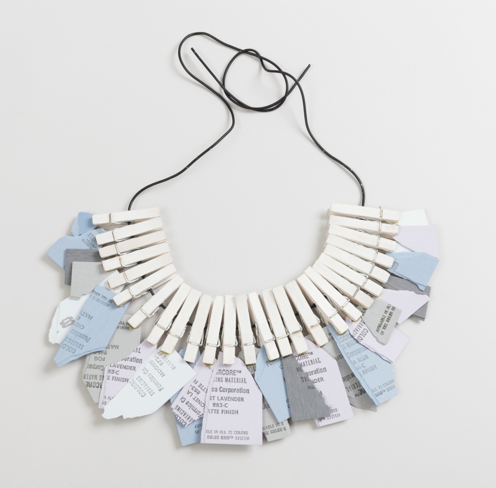 Necklace from the Colorcore Personal Adornment Series Necklace; Designed by Robert Ebendorf; Collaborator: Ivy Ross (American, b. 1955); colorcore formica fragments, clothespins (painted wood, metal), cord; L x W x D: 36.3 × 26.4 × 1.3 cm (14 5/16 × 10 3/8 × 1/2 in.); The Susan Grant Lewin Collection, Cooper Hewitt, Smithsonian Design Museum; 2016-34-19