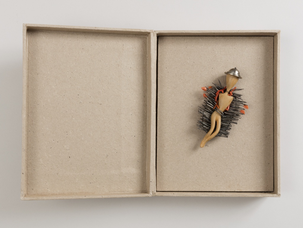 This brooch is part of a series in which Slemmons “repaired” or finished the incomplete work of other jewelers whose work she admired. Here, Slemmons placed Bruce Metcalf’s carved emaciated and faceless figure on a silver nest with coral flames to evoke “a hotbed of ideas.”